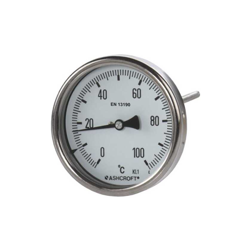 Ashcroft AM bimetal thermometer 160 mm, range 0-200 C, dry, steam lenght 100 mm, Plain (no thread) rear connection, Accuracy class 1, IP66, steam and process connection Stainless steel 316L