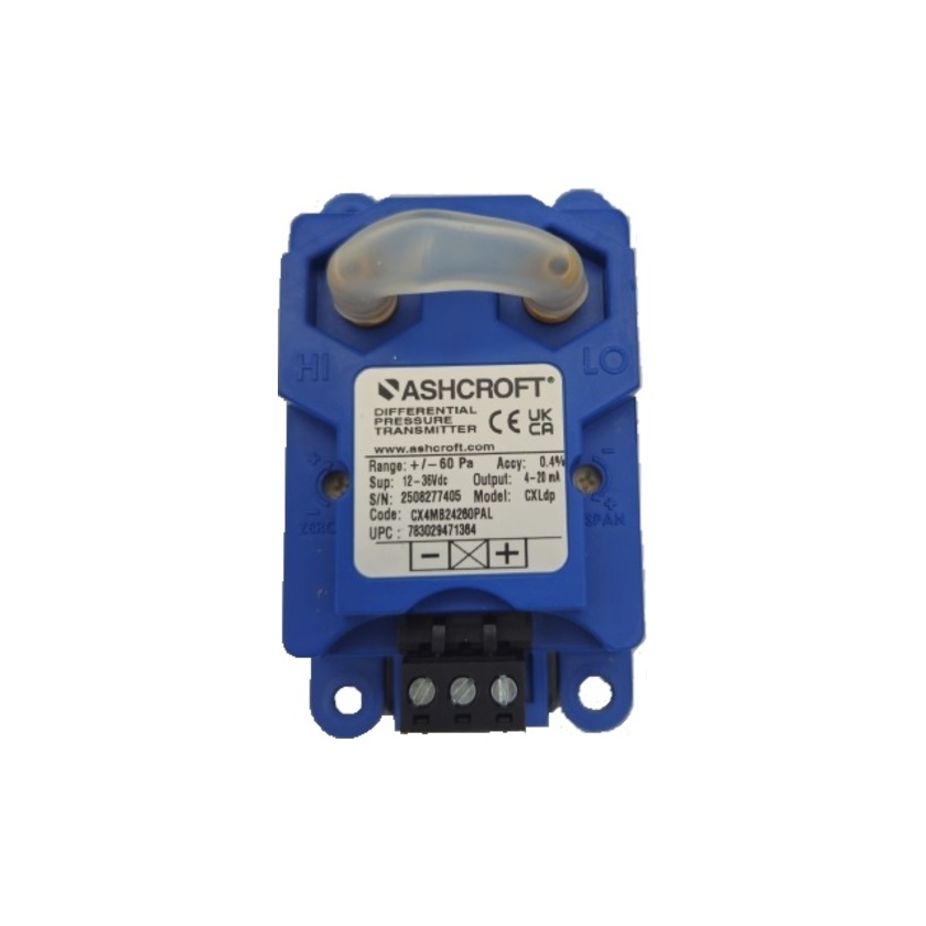 Ashcroft CXLdp Low Differential Pressure Transmitter with accuracy 0.25 %F.S., 1/4 ” brass tubing connections, 4-20 mA (2 wire), range -60…60 Pa, wetted parts: aluminum, glass, silicium, externally accessible potentiometers for zero and span: +/- 5 % of span, supply voltage 12…36 VDC