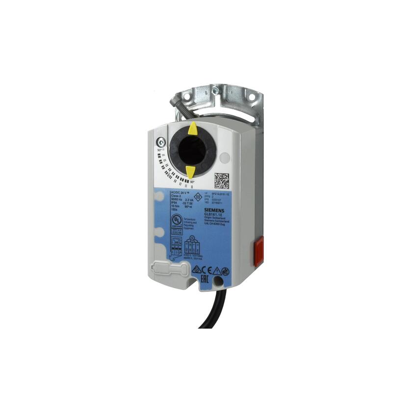 The GLB166.1E is a high-performance rotary air damper actuator from Siemens offering 10 Nm nominal torque, suitable for dampers up to 1.5 m2 (friction dependent), for 0-10 V control and 150 sec rotation time. It is powered by 24 VAC and provides IP54 protection for use in HVAC and automation environments. Shaft coupling is via a self-centering adapter with mechanical angle limits from 0-90 degree. The actuator comes prewired with a 0.9 m cable.