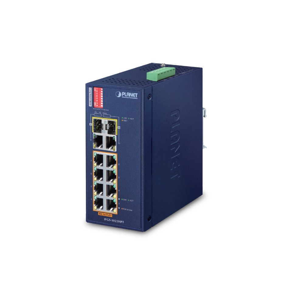 IFGS-1022HPT 8-Port 10/100TX 802.3at PoE + 2-Port Gigabit TP/SFP Combo Industrial Unmanaged Fast Ethernet PoE Switch, Planet