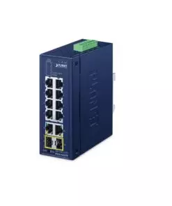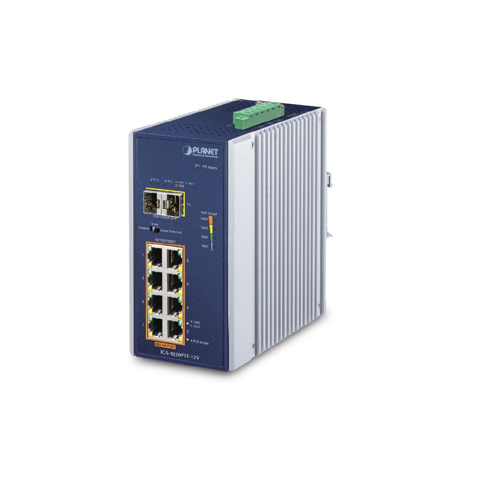 IGS-1020PTF-12V 8-Port 10/100/1000T 802.3at PoE + 2-Port 100/1000X SFP Industrial Unmanaged Gigabit Ethernet PoE Switch with 12V Booster, Planet