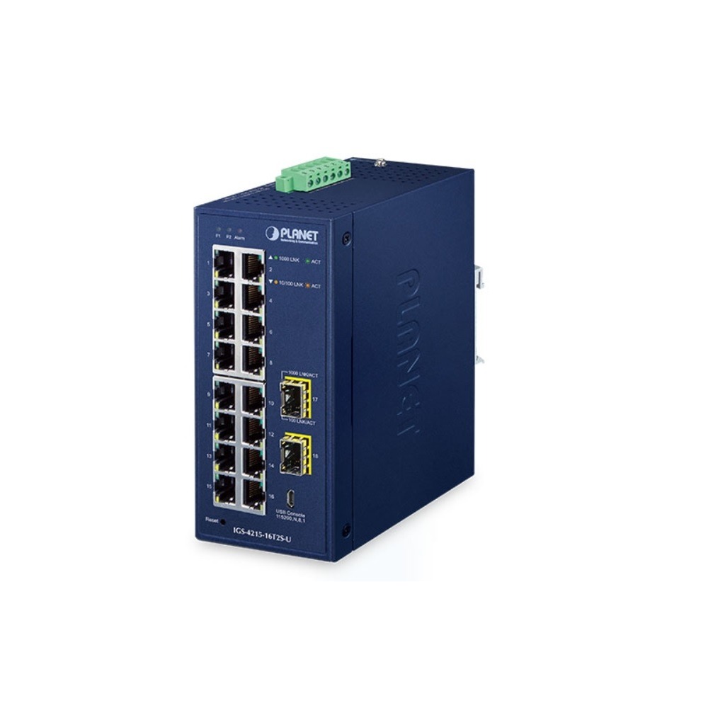 IGS-4215-16T2S-U 16-Port 10/100/1000T + 2-Port 100/1000X SFP Industrial L2/L4 Managed Gigabit Ethernet Switch with USB Console, Planet