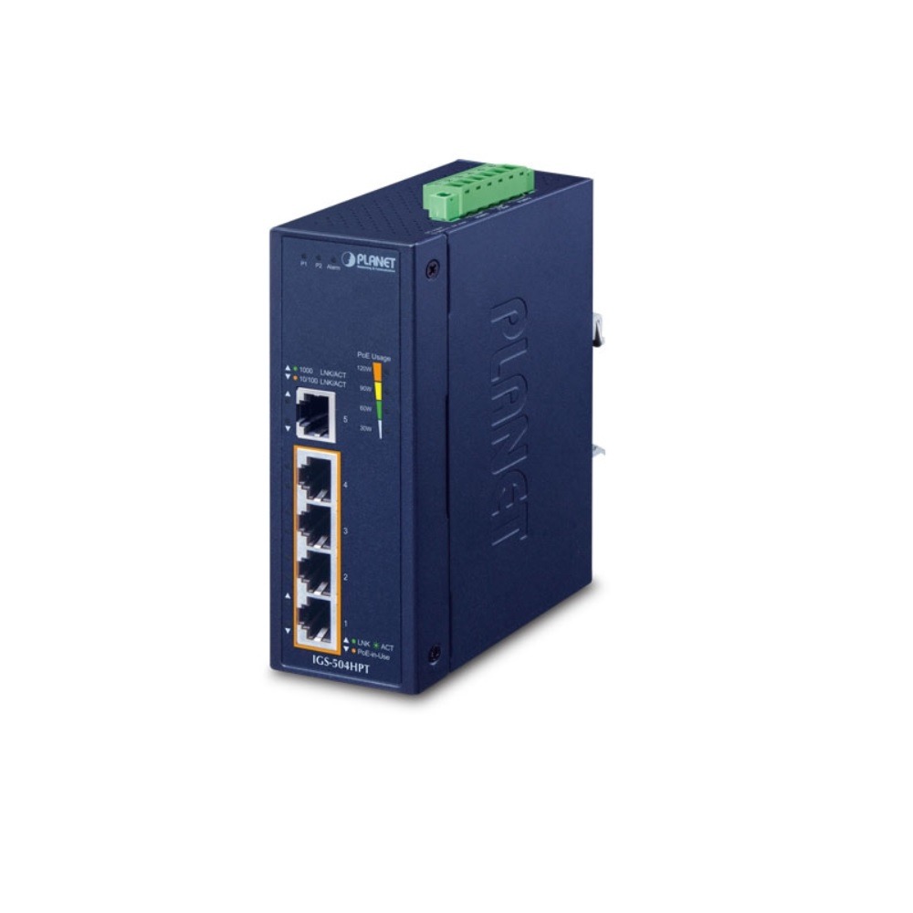 IGS-504HPT 4-Port 10/100/1000T 802.3at PoE + 1-Port 10/100/1000T Industrial Unmanaged Gigabit Ethernet PoE Switch, Planet