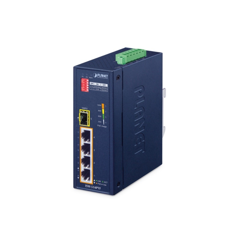 ISW-514PTF 4-Port 10/100TX 802.3at PoE+ plus 1-Port 100FX Industrial Unmanaged Fast Ethernet PoE Switch, Planet