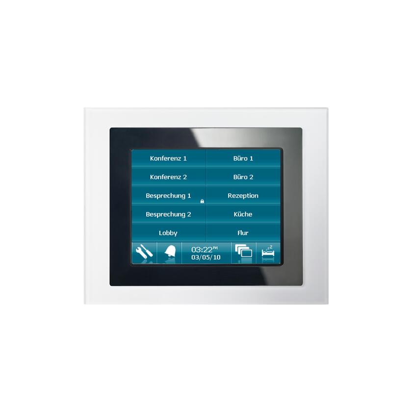 Siemens UP 588/23 TouchPanel 320 x 240 pixels, TFT, 152 x 123 mm (7″), power supply 24 VAC. Display and control of 110 KNX functions max 20 pages. 24 V AC/DC