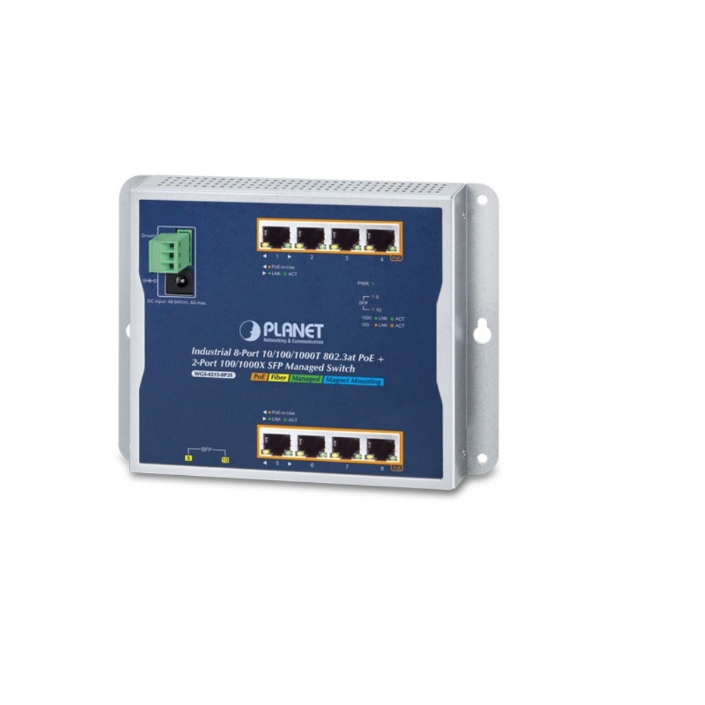 WGS-4215-8P2S 8-Port 10/100/1000T 802.3at PoE + 2-Port 100/1000X SFP Industrial Wall-mount L2+ Ring Managed Gigabit Ethernet PoE Switch, Planet